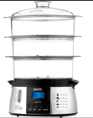 بخارپز میگل مدل GSC800 یکی از منحصر به فردترین و سالم ترین دستگاه هایی است که اخیرا طرفداران بسیاری را به خود اختصاص داده. این محصول با گنجایش 10 لیتر، این امکان را می دهد تا بتوان به سهولت انواع غذاهای رژیمی و کم کالری را ظرف مدت کوتاهی آماده نمود. میگل برای این مدل 3 طبقه در نظر گرفته و می توان در هر طبقه به صورت مجزا مواد غذایی مختلفی را بخارپز کرد. به همراه بخارپز Migel GSC800 ظرف مخصوص پخت برنج نیز ارائه شده و برای استفاده آسانتر، بر روی بدنه مدت زمان طبخ هر نوع مواد غذایی چاپ شده. همچنین صفحه دیجیتالی و تایمر قابل تنظیم تا حداکثر 40 دقیقه از دیگر امکانات برجسته این محصول میگل تلقی می شود که آن را به یک دستگاه بی نظیر مبدل کرده است.