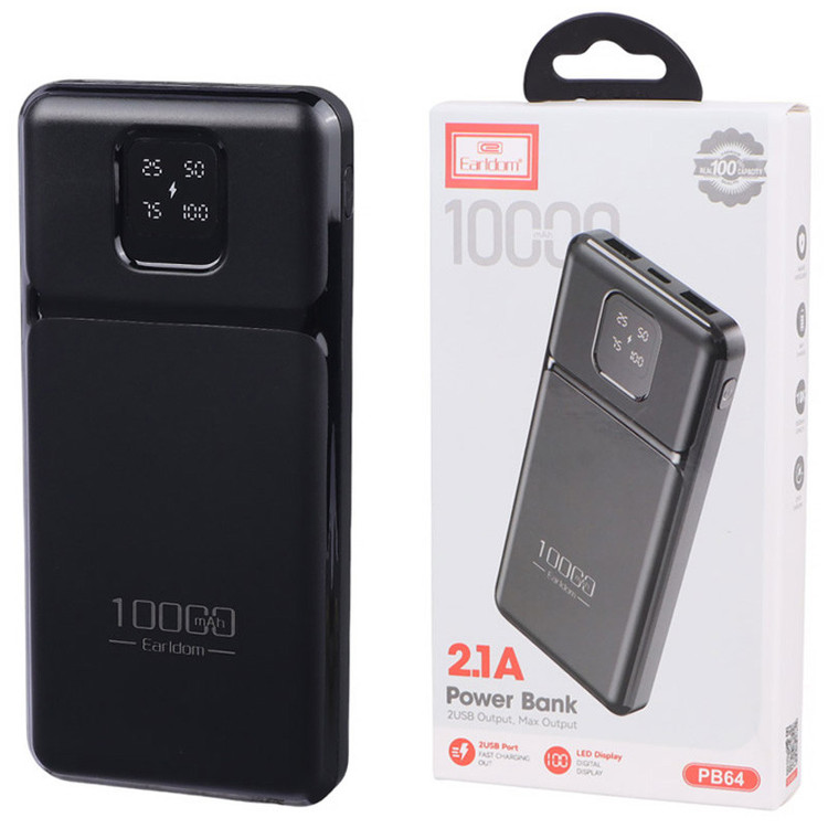 پاوربانک ارلدام مدل PB64 با ظرفیت 10000 میلی آمپر با بروزترین فناوری های روز دنیا دارای ظاهری مستطیلی شکل و رنگ مشکی براق دارای نشانگر LED وضعیت شارژ که همراه بسیار عالی برای شارژ دستگاه های الکترونیکی در هنگام سفر و خارج از خانه است. پاوربانک Earldom ظرفیت 10000 میلی آمپر ساعت مدل PB64 میتواند به طور همزمان 2 عدد موبایل را شارژ کند.همچنین قابلیت شارژ همزمان دو دستگاه را دارد.این پاوربانک با شدت جریان خروجی 2.1 آمپر میتواند موبایل ، تبلت و یا هر گجت دیگر را شارژ کند. این پاوربانک از قابلیت شارژ سریع استفاده نمیکند
