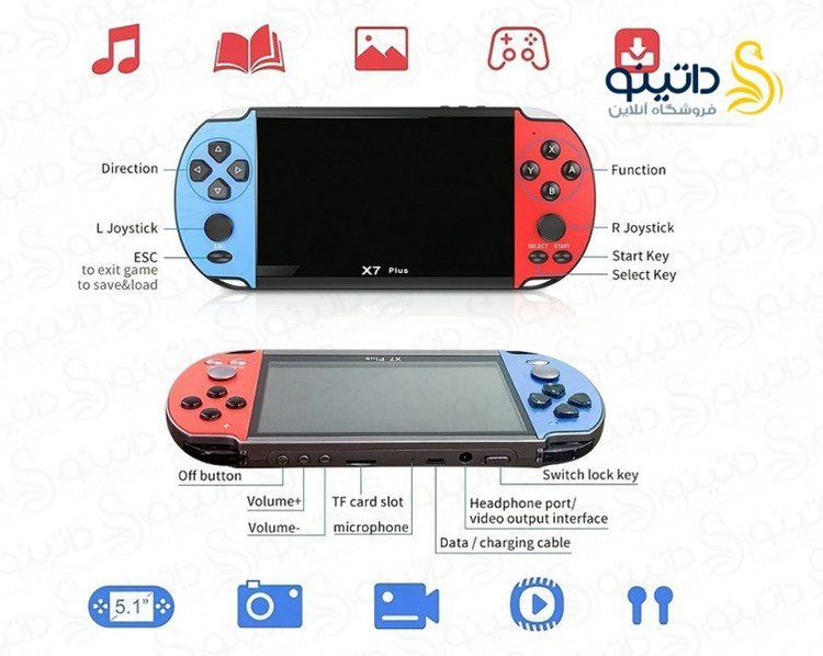 کنسول بازی قابلحملX7 وسیلهی سرگرمی مقرونبهصرفهای است که برای همه گزینهی بسیار خوبی محسوب میشود. این محصول، در ابعاد بسیار مناسب و ارگونومی قابل قبولی طراحی شده است که باعث میشود گیمر از بازی با آن احساس خستگی نکند. این مدل دارای یک صفحهنمایش 4.3اینچی است که با دقت 480×272 پیکسل طراحی شده است. در قسمت سمت راست این صفحه، 4 دکمهی اصلی، دکمههای Start و Select و دکمههای کنترل سطح صدا تعبیه شدهاند؛ همچنین در قسمت سمت چپ، دکمههای جهتدار و یک آنالوگ استیک قرار گرفتهاند. چینش دکمهها در این کنسول، متناسب با قرارگیری آن در دست طراحی شده است. این کنسول که از نوع شارژی محسوب میشود، با اتصال به برق، با سرعت قابلقبولی شارژ میشود. این کنسول 8 گیگابایت حافظهی داخلی دارد که در نصب و راهاندازی انواع بازی بسیار کارآمد است؛ همچنین در صورتی که نیاز به فضای بیشتری برای نصب بازی داشته باشید، میتوانید به آن کارتحافظهی Micro SD متصل کنید.