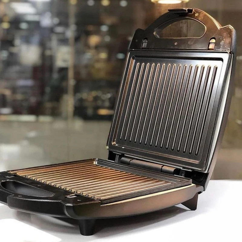 جنس استیل و پلاستیک فشرده ساندویچ ساز وافل ساز صفحه گریل تابه ی نچسب دستگیره عایق حرارت قابلیت کنترل اتوماتیک دما صفحات دارای پوشش نچسب قابلیت شستشوی آسان پایه ضد لغزش دارای ضامن برای قفل کردن