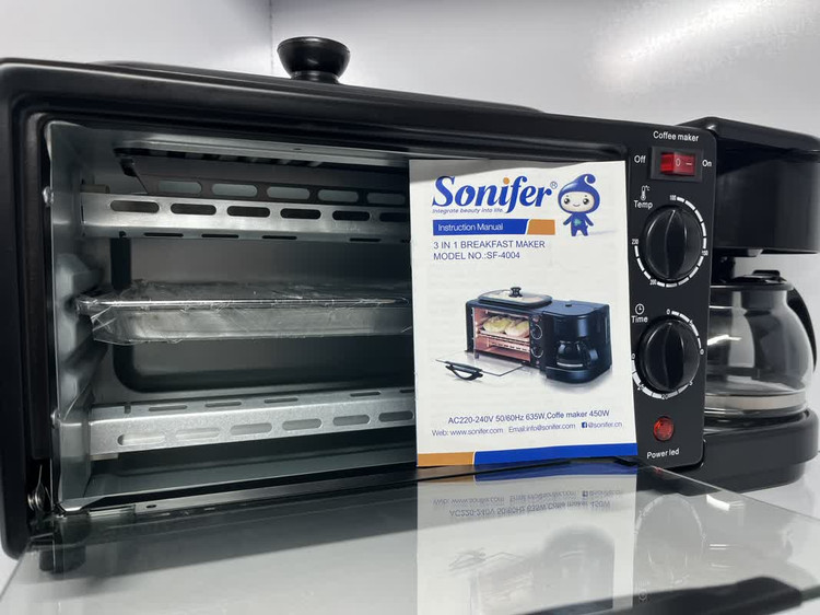 صبحانه ساز سه کاره سونیفر مدل ۴۰۰۴ دستگاه صبحانه سونیفر یک سه کاره کامل و جمع و جور برای تهیه صبحانه و عصرانه است . این دستگاه از توستر ،قهوه ساز و ماهیتابه برقی تشکیل شده که هر کدام به تنهایی از ملزومات زندگی روزمره می باشد. صبحانه سونیفر یکی از کارآمدترین لوازم آشپزخانه به شمار می آید، شما میتوانید به وسیله آن نان برشته و تست کنید و در عین حال یک نسخه کوچک از اجاق گاز نیز در اختیار دارید . از ویژگی های این دستگاه به قابلیت تنظیم زمان و حرارت اشاره کرد . قهوه ساز این دستگاه یک قهوه ساز چکه ای است.
