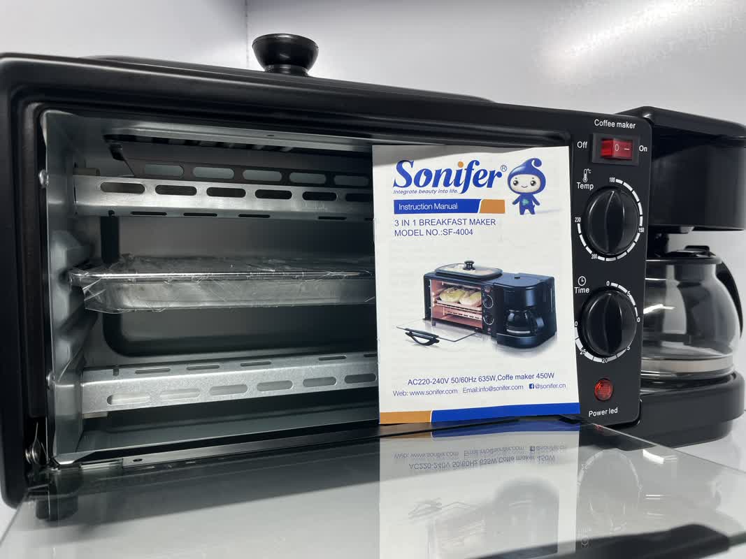 دستگاه صبحانه ساز سونیفر یک سه کاره کامل و جمع و جور برای تهیه صبحانه و عصرانه است. این دستگاه از آون تستر، قهوه ساز و ماهیتابه برقی تشکیل شده که هر کدام به تنهایی از ملزومات زندگی روزمره می باشد. آون توستر یکی از کارآمدترین لوازم آشپزخانه به شمار میآید، که شما می توانید به وسیله آن نان برشته وتست کنید و در عین حال یک نسخه کوچک از اجاق گاز نیز در اختیاردارید. از ویژگیهای آون توستر آن میتوان به قابلیت تنظیم زمان و حرارت اشاره کرد. قهوه ساز این دستگاه یک قهوه ساز چکه ای ( drip coffee) است که درب قسمت بالایی محفظه باز شده و یک عدد فیلتر یا همان صافی قابل جدا سازی و شستشو نیز در داخل محفظه وجود دارد. کافی است داخل مخزن آب را پر کرده و سپس با پیمانه داخل فیلتر، قهوه بریزید، به همین راحتی قهوه ای خوش طعم و معطر خواهید داشت. ماهیتابه برقی نیز آخرین عضو این مجموعه است که به راحتی و با استفاده از آن قادر هستید غذای مورد نیاز خود را تهیه کنید. خرید این محصول شما را از خرید جداگانه سه محصول ذکر شده بی نیاز می سازد و بسیار مقرون به صرفه است و با حجم کمی که دارد می تواند شما را از دردسر خرید و نگهداری بسیاری از ابزار آشپزخانه و شلوغی و اشغال جای زیاد راحت کند.