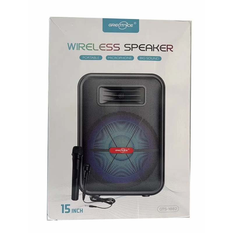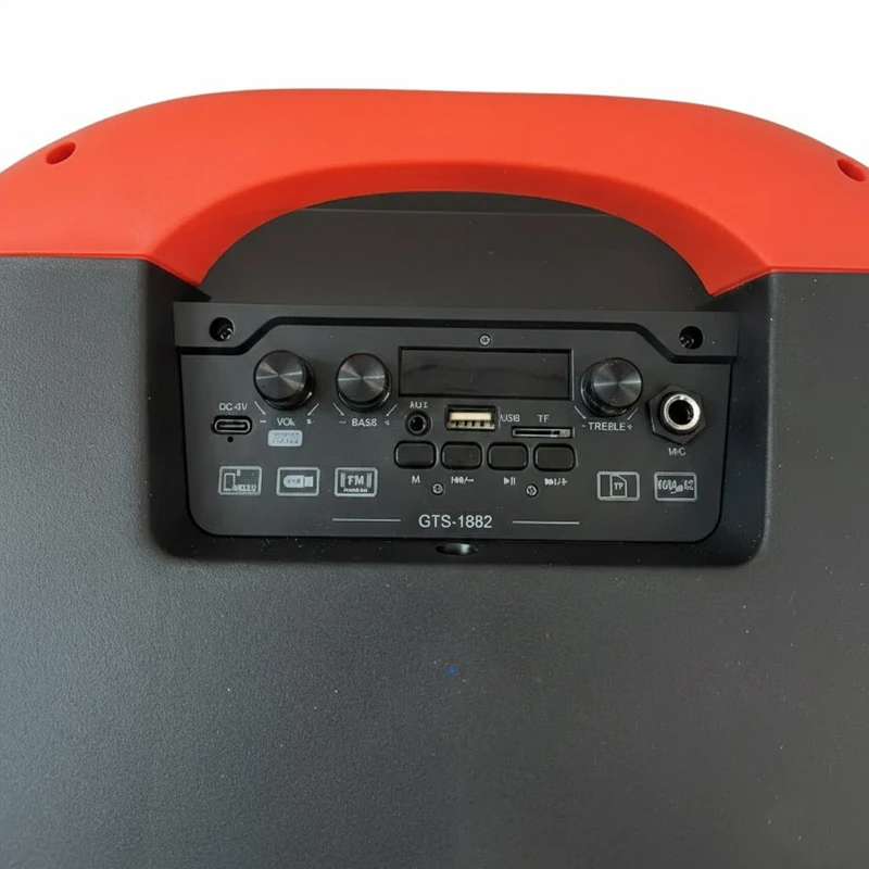 اسپیکر ۱۸۸۲ kts نوع رابط یو اس بی (USB) محدوده توان ۲۱ تا ۵۰ وات قابلیت شارژ مجدد از طریق پورت سوزنی و کابل همراه برد اتصال بلوتوث ۱۰ متر ابعاد ۲۹.۵*۴۰.۵*۵۶.۹ سانتی متر جنس بدنه پلاستیک با کیفیت کلید فیزیکی به منظور مدیریت موسیقی، میزان صدا، Mood و ... نحوه اتصال بی سیم سیمی پاسخ فرکانسی ۲۰ هرتز الی ۲۰ کیلوهرتز مدت زمان شارژ دهی با ولووم ۷۵ درصد ۱ ساعت به بالا پشتیبانی از AUX دارد پشتیبانی از بلوتوث دارد درگاه شارژ سوزنی درگاه میکروفون دارد نشانگر LED دارد قطر درایو ۱۵ اینچ اقلام همراه کابل شارژ سوزنی یک عدد میکروفون بی سیم یک عدد میکروفون با کابل همراه حساسیت سیگنال به نویز ۸۰ دسی بل تامین انرژی باتری داخلی ظرفیت باتری ۱۸۰۰ میلی آمپر ساعت پشتیبانی از فلش مموری USB تا ۳۲ گیگابایت توان خروجی RMS ۵۰ وات تعداد درگاه USB ۱ عدد نورپردازی داخلی چند رنگ مدت زمان شارژ شدن حدود ۴ ساعت نمایشگر LED دارد پشتیبانی از کارت حافظه Micro SD تا حداکثر ۳۲ گیگابایت